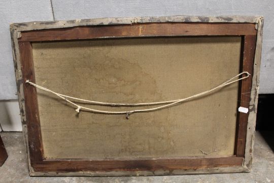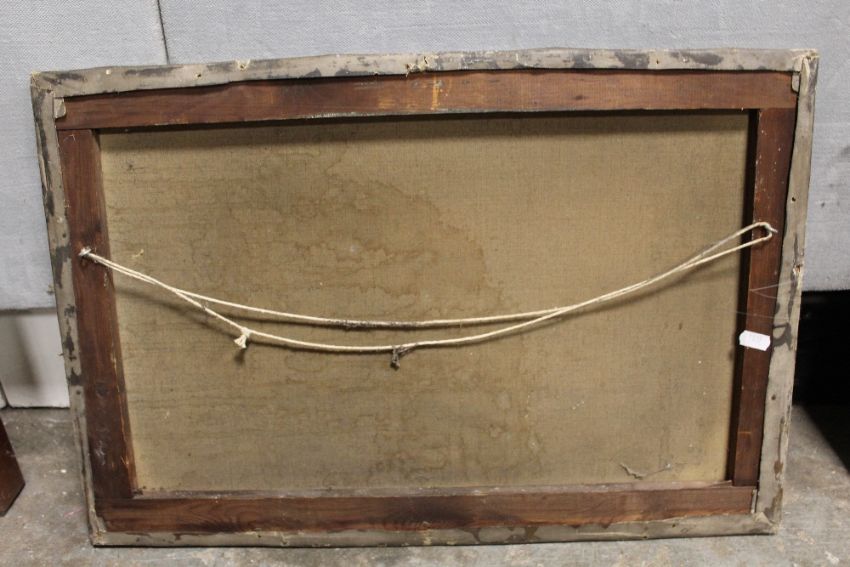 AN UNFRAMED ANTIQUE OIL ON CANVAS DEPICTING A RURAL LANDSCAPE WITH CHURCH INDISTINCTLY SIGNED LOWER RIGHT