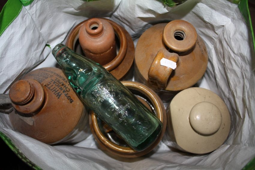 A COLLECTION OF VINTAGE STONEWARE TO INCLUDE FLAGONS, BOTTLES ETC. TOGETHER WITH A VINTAGE GLASS BOTTLE AND A WASHBOARD ETC.