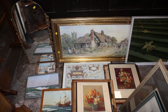A QUANTITY OF ASSORTED PRINTS TO INCLUDE A GILT FRAMED PRINT OF A COTTAGE TOGETHER WITH AN ARCHED MIRROR AND A MAP
