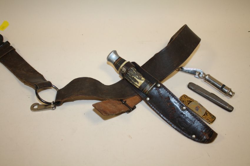 A SCOUTS LEATHER KNIFE BELT TOGETHER WITH TWO OTHER PENKNIVES