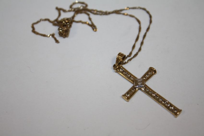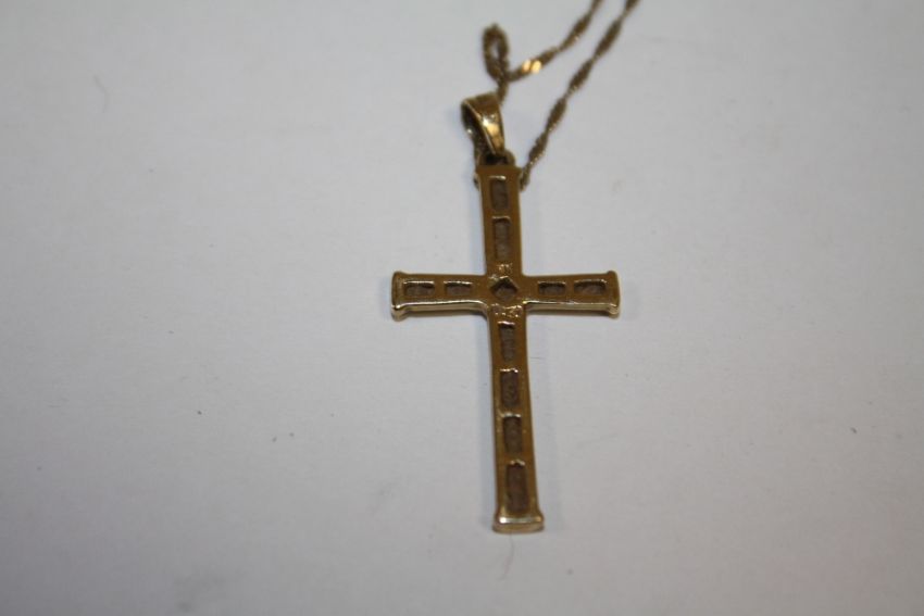 A 9K GOLD DIAMOND SET CROSS PENDANT ON CHAIN (CHAIN A/F)