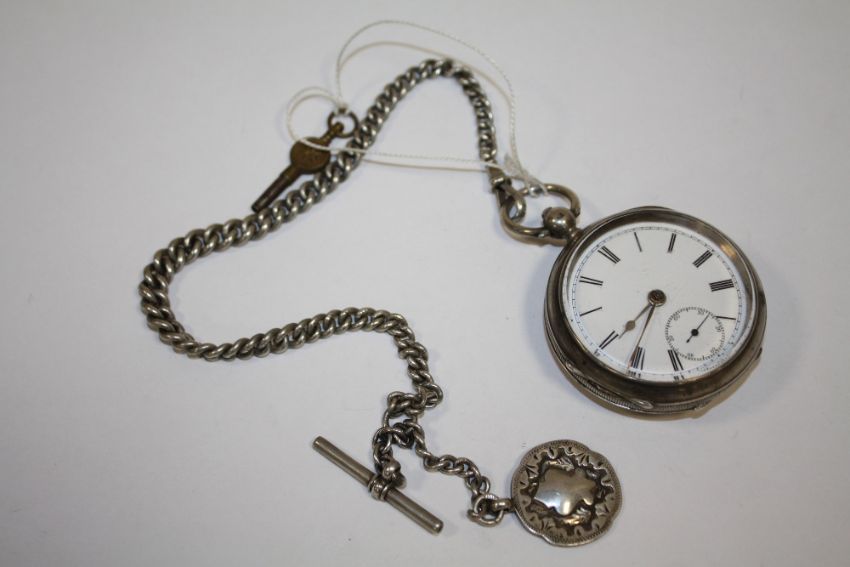 AN ANTIQUE SILVER POCKET WATCH ON SILVER ALBERT CHAIN WITH FOB