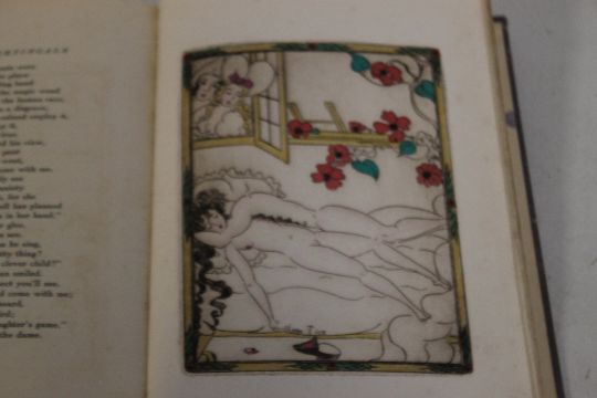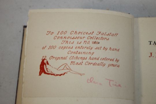 CLARA TICE - 'TALES AND NOVELS OF J. DE LA FONTAINE with 12 original etchings by Clara Tice', Vol. II only, privately printed at the printing house of G. J. Thieme, Nijmegen, Holland 1929. Pasted in plate states "'To 100 Choicest Falstaff Connoisseur Collectors This is No. 1 D of 100 copies entirely set by hand containing 12 Original etchings hand colored by Most Cordially yours Clara Tice"' . There are just 6 etchings in this volume.