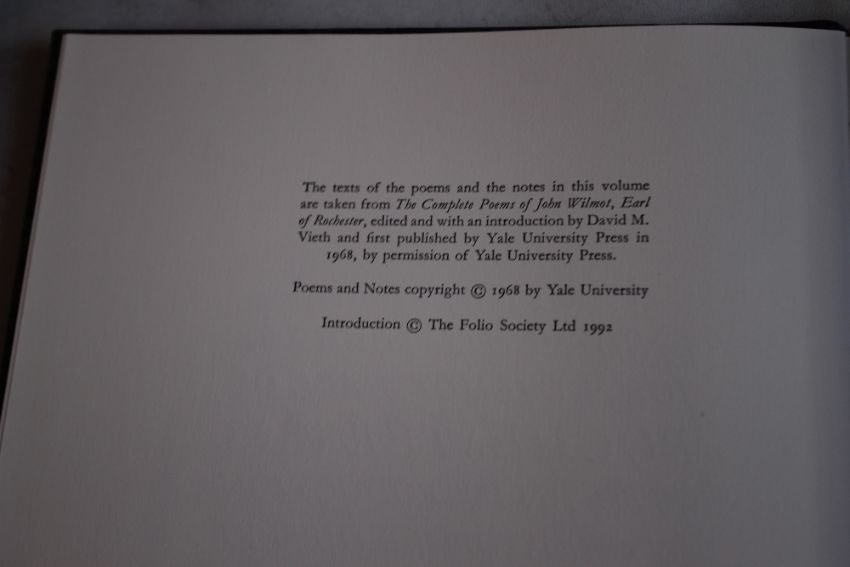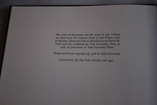FOLIO SOCIETY - 'PERFECT AND IMPERFECT ENJOYMENTS: POEMS BY JOHN WILMOT EARL OF ROCHESTER', with an introduction by Christopher Hibbert and illustrated with paintings by Richard Shirley Smith, 1992, in fitted box, limited edition 257 / 500, pencil signed by the artist