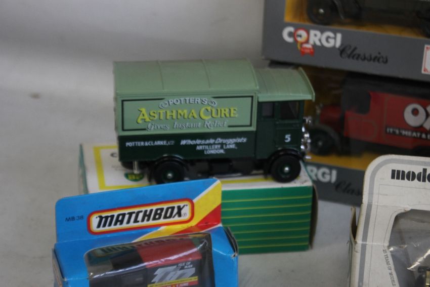 NINE CORGI TRUCKS/BUSES plus two Matchbox cars and one Matchbox truck.