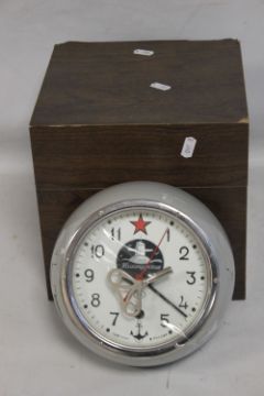 A VINTAGE RUSSIAN SUBMARINE BULKHEAD CLOCK GREY PAINTED ALLOY CASE, in a fitted wooden storage boxCondition Report: The clock ticks when wound but we give no guarantee as to working capacity