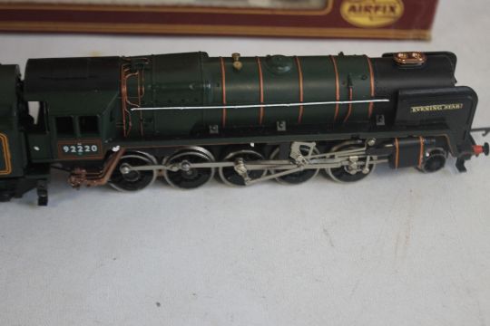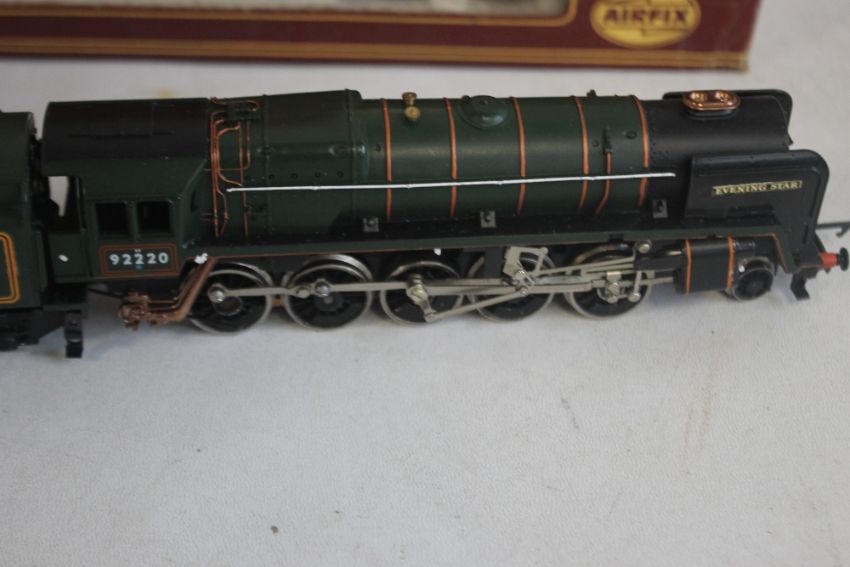 A BOXED OO GAUGE HORNBY R303 'EVENING STAR' STEAM LOCOMOTIVE AND TENDER, boxed OO gauge Airfix 'Caerphilly Castle' steam locomotive and tender (4-6-0) plus two boxed Hornby tank units R.041 and R.252