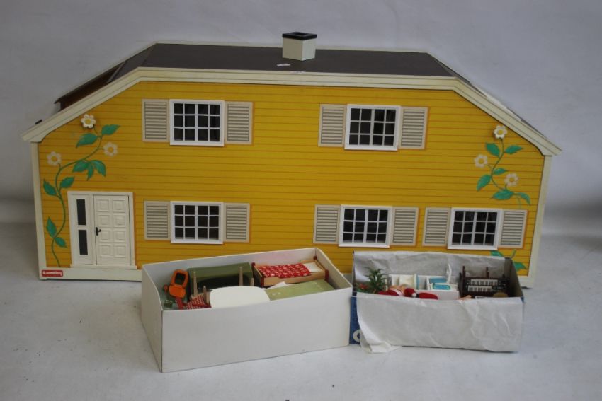 A 1970s LUNDBY DOLLS HOUSE, with two boxes of furniture and small dolls etc.
