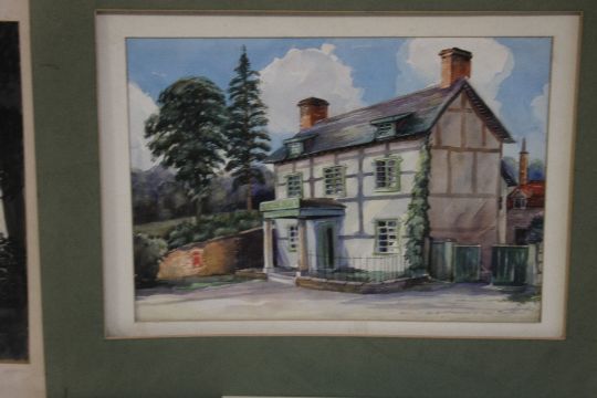 ORIGINAL ARTWORK - OIL PAINTINGS, WATERCOLOURS ETC., to include a watercolour of a blue door showing signature R. Wintz with a pencilled signature under R. W. Moss, cottages signed L. Wilkins, a floral study signed A. Gurteiger (?), a continental view signed Cyril Bradshaw, a pierrot signed De Courcey, a seascape watercolour signed T. Castle and amateur paintings of Stafford Park by F. Guest 1971, etc.