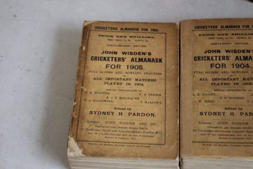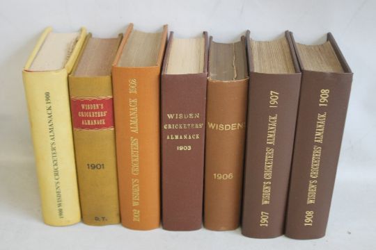 WISDEN CRICKETERS' ALMANACK 1900 - 1909, comprising 1900 rebound, 1901 rebound, 1902 rebound, 1903 rebound, 1904 softback, 1905 softback, 1906 rebound, 1907 rebound, 1908 rebound, 1909 softback (10)