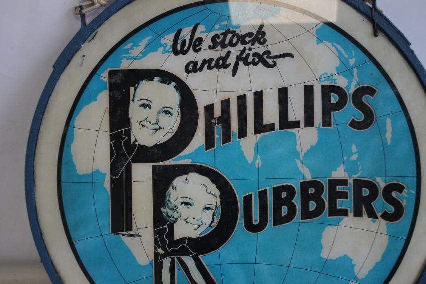 A VINTAGE "'PHILLIPS RUBBERS"' double sided glass shop sign with metal frame, diameter 58 cm