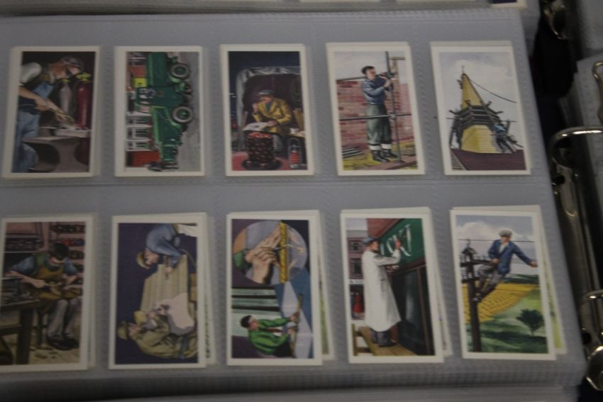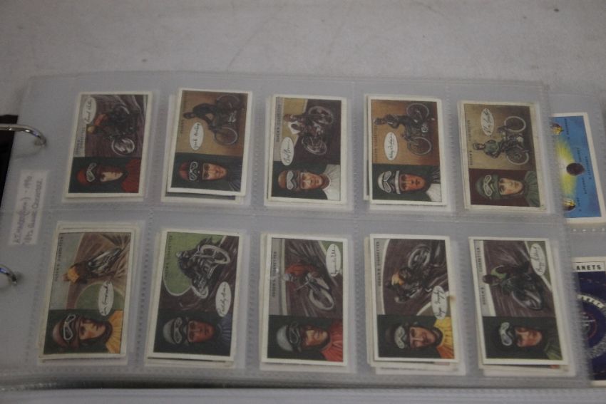SIX FOLDERS CONTAINING SETS OF COLLECTORS CARDS BY STOLLWERK, LIEBIG, SUGAR PUFFS, WILLS, BADSHAH TEA, AT MARKS, BROOKE BOND, ETC. includes rare Ogdens- Famous Dirt Track Riders.