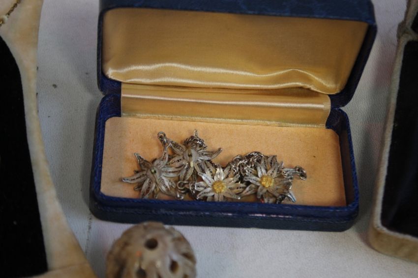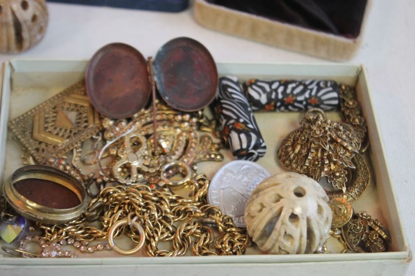 A CIGAR BOX OF VINTAGE COSTUME JEWELLERY, to include a brooch made from a nurse's buckle etc