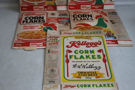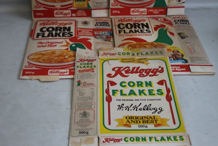 FIVE EMPTY KELLOGG'S CORN FLAKE PACKETS 1980S, to include Special Diamond Jubilee Pack, Morecambe & Wise Sunshine Fund Appeal (missing piece on the back), two Free EMI Super C60 tape, year 2000 competition for 100 Sinclair Spectrums c.1984 (5)