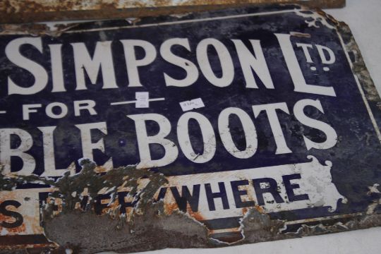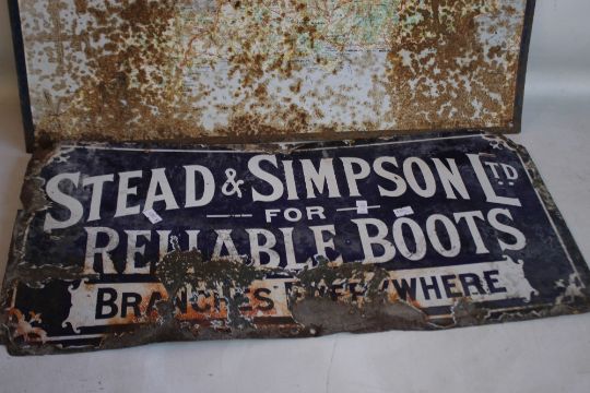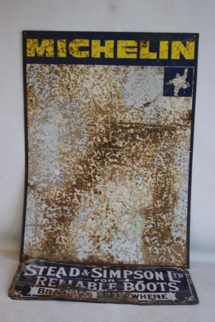A "'STEAD & SIMPSON FOR RELIABLE BOOTS."' ENAMEL ADVERTISING SIGN, 61 cm x 30 cm, along with a Michelin tin sign 86 cm x 63 cm (both A/F)