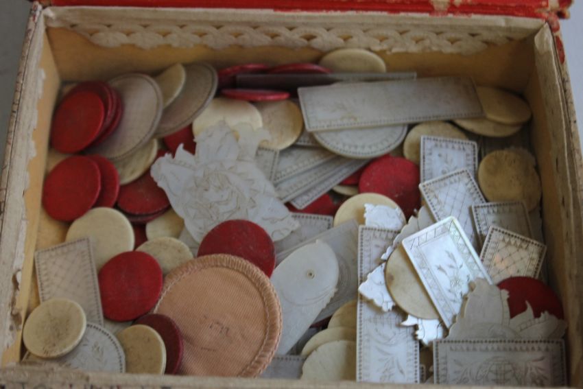A SHEFFIELD BANK "'JOHN AND WILLIAM SHORE"' 10 shillings and sixpence (half guinea) bank note A/F (Rugged with old paper tape repairs) a Belgium 1931 100 franc note, a German 1922 50,000 DM note and a quantity of Mother of Pearl and other counters.