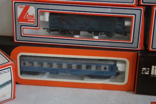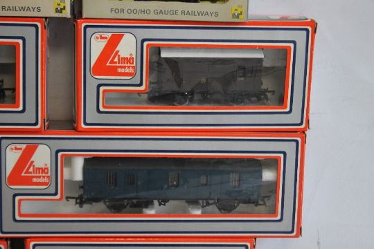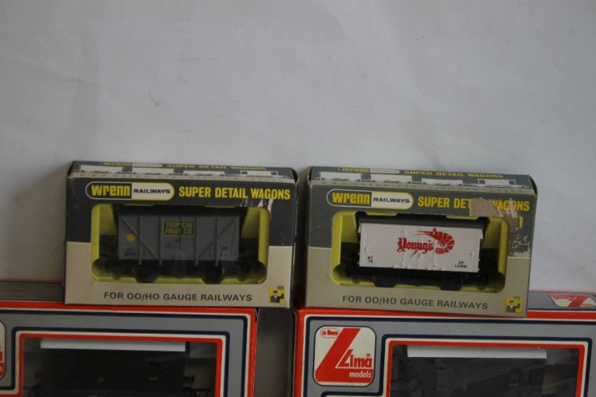 TWO BOXED LIMA GOLDEN ARROW CARRIAGES 9200, FOUR BOXED LIMA COVERED WAGONS 305625W, 'OO GAUGE', two boxed Lima Carriages 305356W, two boxed Wrenn Covered Wagons W5063 Banana Van and W5052 Youngs Refrigerator Van, two Boxed Playcraft Carriages, boxed Lima Mobil Container Truck 600990, boxed Lima Drive through Coach Wash 600951.