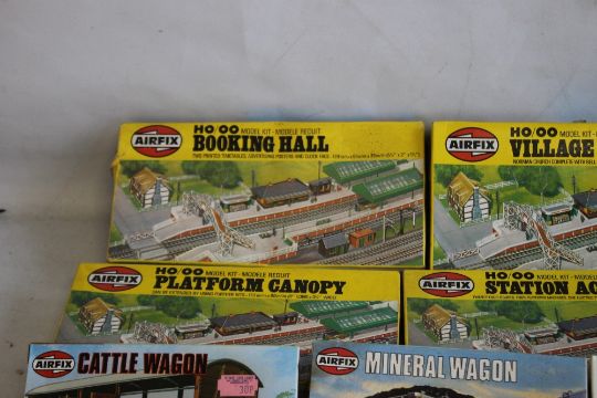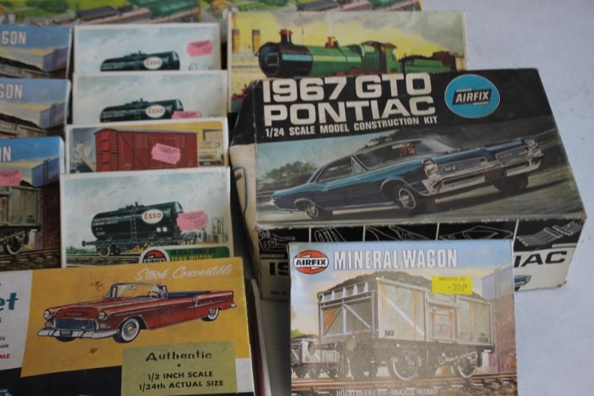 EIGHTEEN BOXED OO GAUGE RAILWAY AIRFIX KITS OF TANKS, WAGONS, BUILDINGS ETC. and Airfix Pontiac 1/24 scale construction kit and monogram Hobbykit 1955 Chevrolet kit.