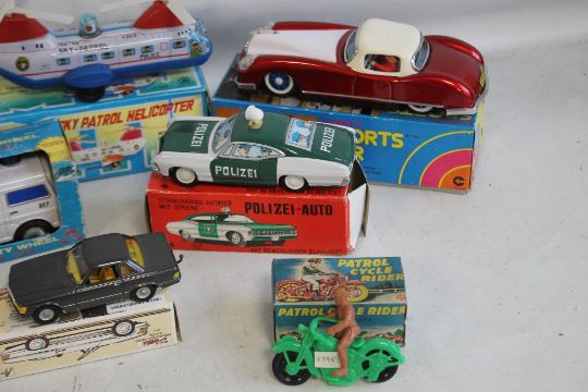 TEN TIN PLATE TOYS, to include Sky Patrol Helicopter, sports car, spinning top, etc