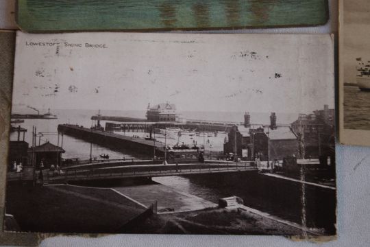 R.M.S. MAURETANIA 'RULE BRITANNIA' POSTCARD together with another of the steam ship with message on the back, one of the TITANIC, an S.S. Lusitania itinerary to Norway & Spitzbergen and two other postcards - 'Union-Castle Line to South and East Africa "'Llangibby Castle"', Lowestoft Swing Bridge (6)