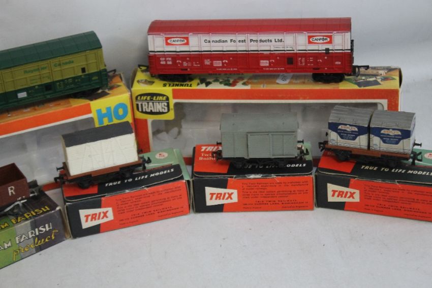 TWO BOXED LIFE LIKE 00 GAUGE BOX CARS 08992 AND ANOTHER, together with four boxed Trix Rolling Stock and one Graham Farrish Rolling Stock