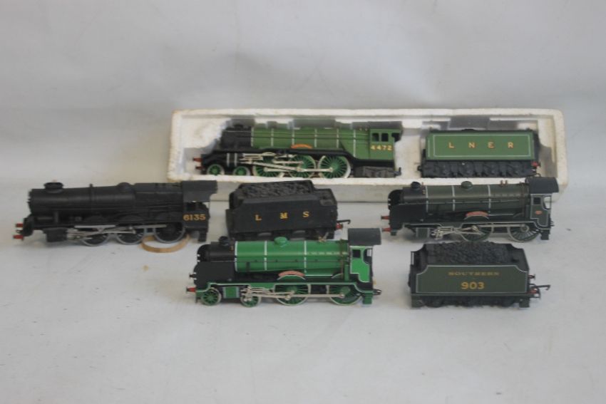 A BOXED HORNBY OO GAUGE 'FLYING SCOTSMAN LNER CLASS A3 LOCOMOTIVE AND TENDER (box A/F), unboxed 'Royal Scot' steam locomotive and tender A/F, unboxed Hornby 'St. Lawrence' locomotive and tender and Hornby 'Shrewsbury' locomotive (no tender)