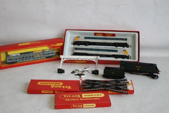 A BOXED HORNBY R555C PULMAN TRAIN SET, BOXED HORNBY WINSTON CHURCHILL STEAM LOCOMOTIVE AND TENNER (4-6-2) 'OO GAUGE', boxed Hornby car transporter with cars R.342, R.140 signal gantry, R.492, R.490 and R.498 level crossing.