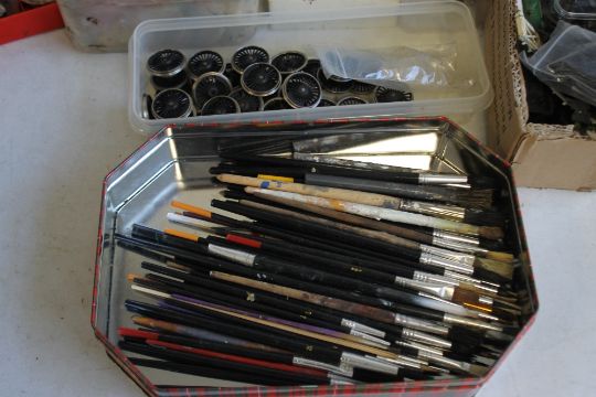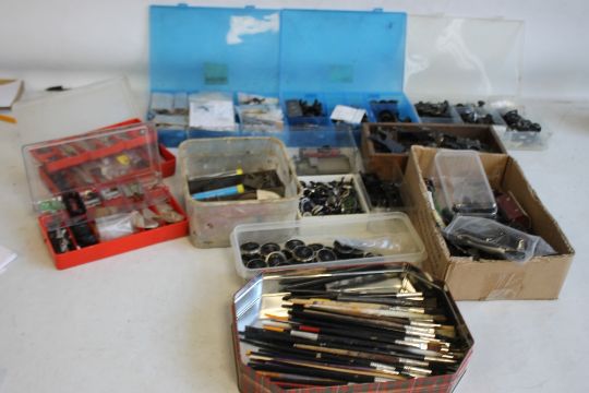 A BOX OF OO GAUGE SPARE PARTS, tools, brushes etc.
