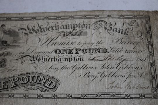A "'WOLVERHAMPTON OLD BANK"' ONE POUND NOTE DATED 4TH JULY 1815, black on white uniface, with hand written annotations to back.
