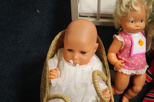 SEVEN LARGE VINTAGE DOLLS PLUS A DOLL IN A MOSES BASKET also including two dolls cots and a blue dolls pram, and two boxes of further dolls and dolls clothes