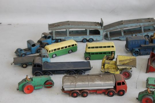 FIFTEEN UNBOXED PLAYWORN DINKY TOYS, to include car transporter, steam roller, Foden tanker, coach, bus, earthmover, car, truck etc.