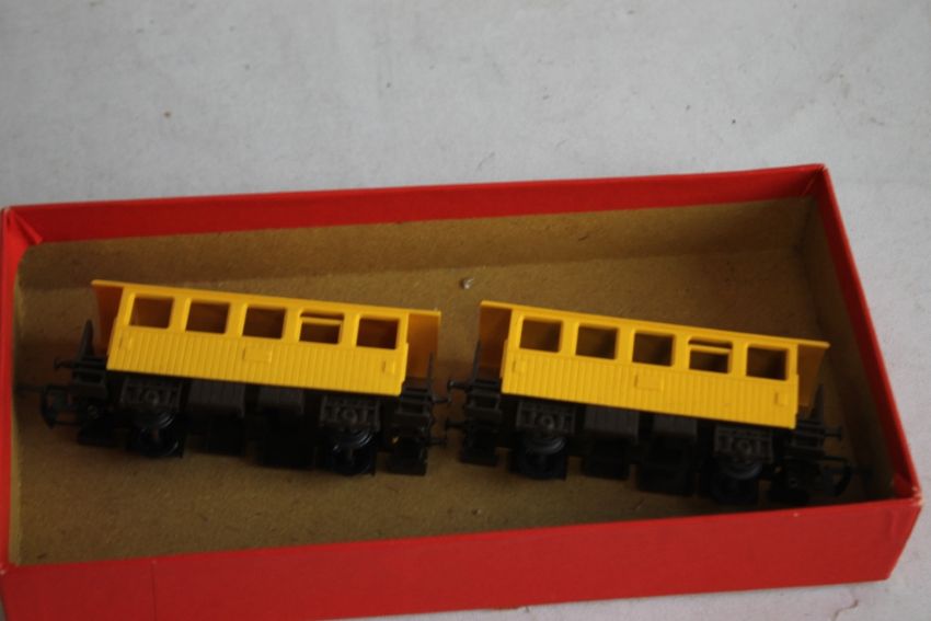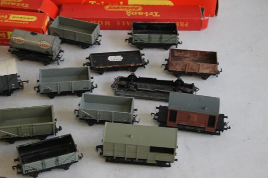 TWENTY-TWO UNBOXED PIECES OF ROLLING STOCK TO INCLUDE COVERED, UNCOVERED WAGONS AND TANKERS 'OO GAUGE', plus six boxed Hornby pieces of Rolling Stock including R.21 Refrigerator Van, R.10 Open Goods Truck, R.118 Bogie Well Wagon, 2x R.16 Guards Van and R.145 Signal Box. Also boxed Giraffe Car Set R.348 and two coaches R.462 Pulman and R.339 BR Sleeping Car.
