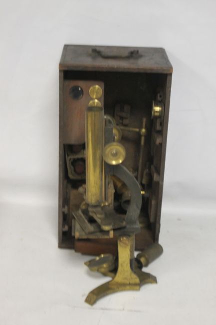 A 19TH CENTURY LACQUERED BRASS MONOCULAR MICROSCOPE, in fitted wooden case with a selection of lens etc