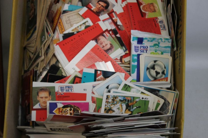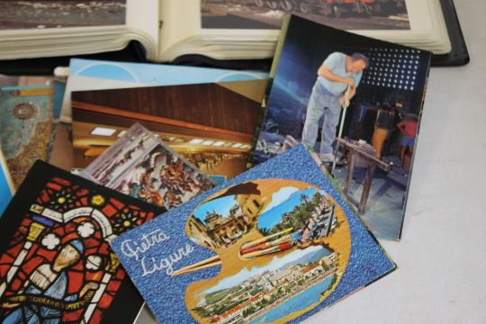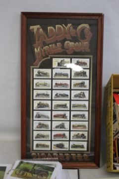TWO ALBUMS OF POSTCARDS AND PHOTOGRAPHS OF MAINLY TRAINS, plus a quantity of loose postcards and a box of Pro Set Football and Football bubble gum Dandy collected cards together with a framed set of railway cigarette cards.