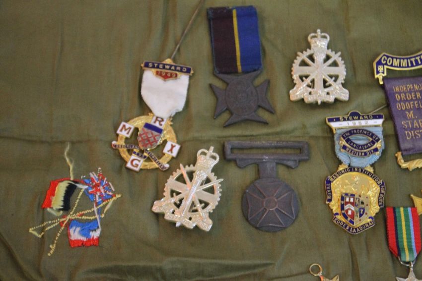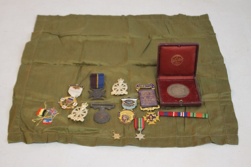 A QUANTITY OF MILITARY INTEREST COLLECTABLES, to include miniature medals, badges etc. and masonic medals