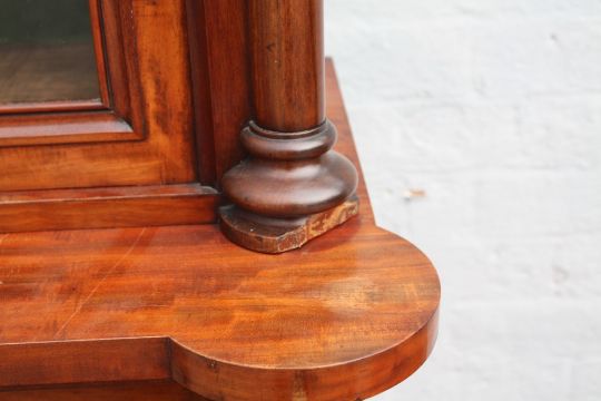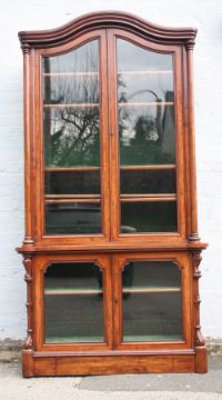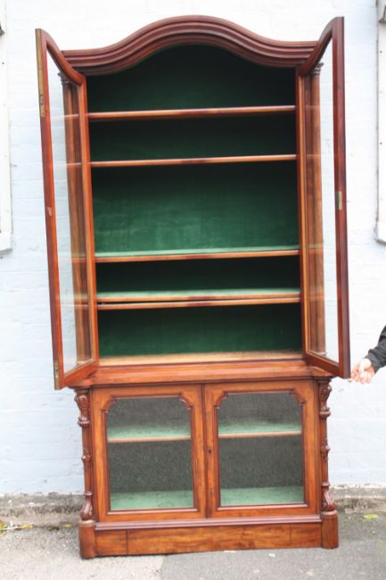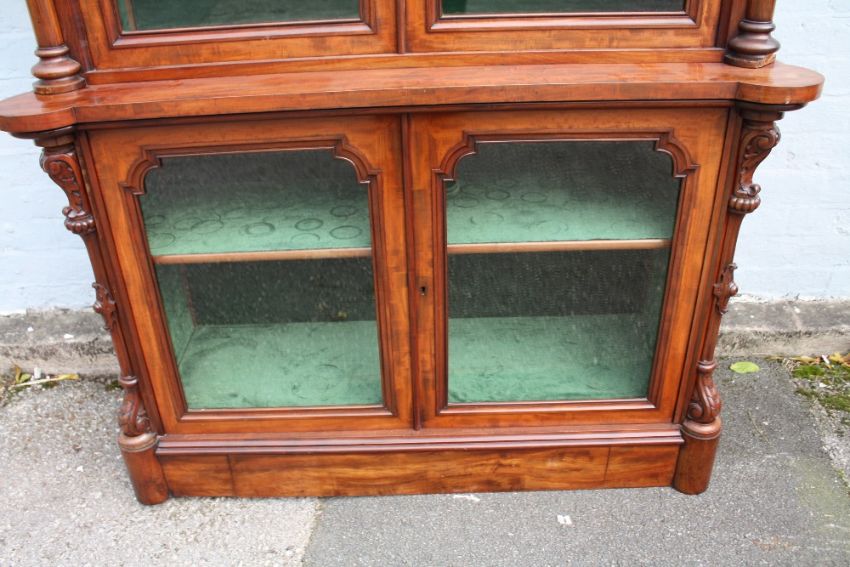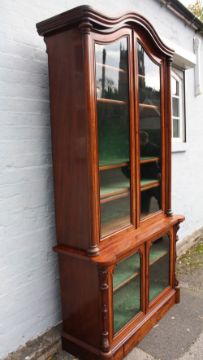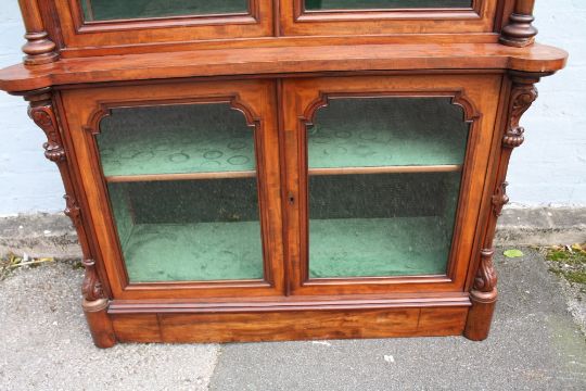 A QUALITY VICTORIAN MAHOGANY GLAZED BOOKCASE, the arched top above two shaped glazed doors, the lower section with two further glazed doors, with carved 3/4 pilasters to the sides, six adjustable shelves to the interior, H 249 cm, W 130 cm, D 49 cm