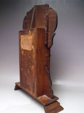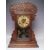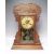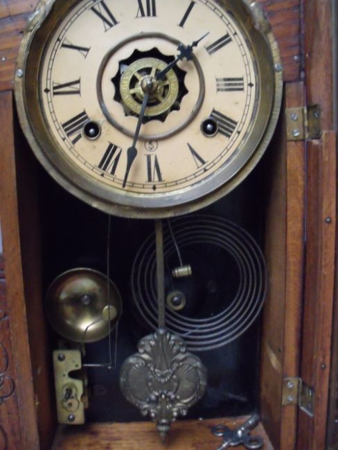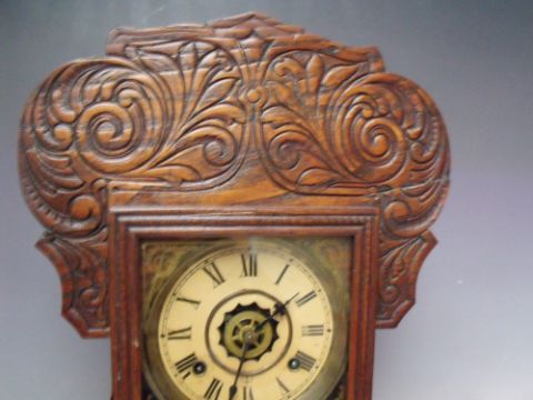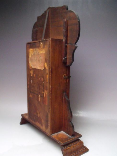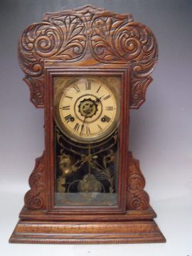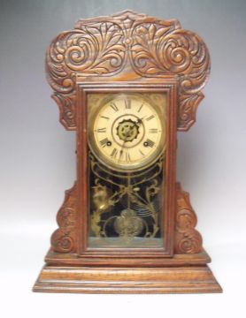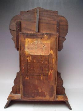 AN ANTIQUE OAK 'GINGERBREAD' MANTLE CLOCK OF TYPICAL FORM, with paper label to reverse, key, pendulum, H 56 cm