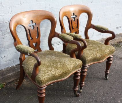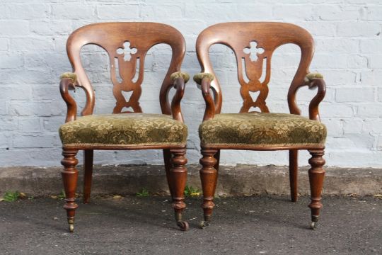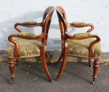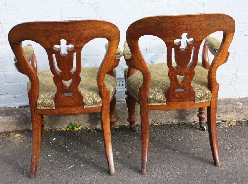 A PAIR OF 19TH CENTURY OAK ARMCHAIRS, having pierced splat back, scroll arms with upholstered pads, raised on turned supports with castors