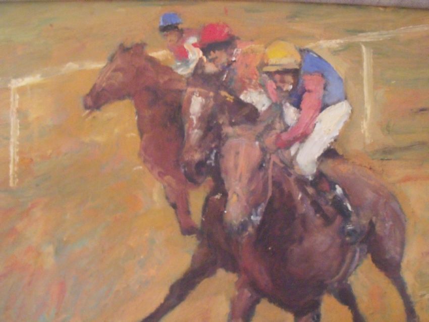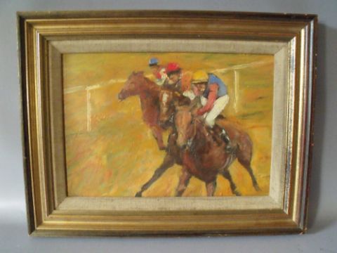 RONALD OLLEY. (XX-XXI). British school, impressionist horse racing scene 'Race to the Finish', see verso, signed lower left, oil on card, framed, 22 x 32 cm