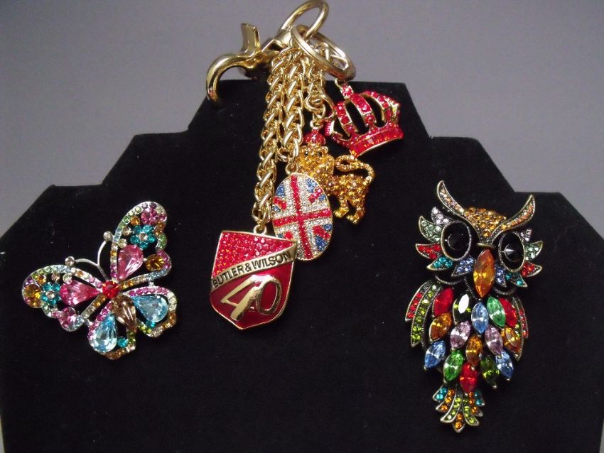 A BUTLER AND WILSON 40TH ANNIVERSARY COMMEMORATIVE KEYRING, together with a gemset owl brooch and a smaller butterfly brooch (3)