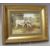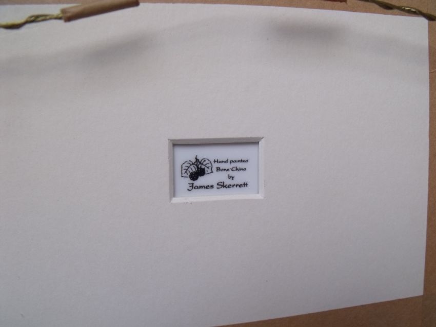 A HAND PAINTED CERAMIC PLAQUE BY JAMES SKERRETT, depicting cattle before a barn, landscape on the distance, gilt framed, signed bottom right, image 12.2 x 17.5 cm, overall 24.5 x 29.5 cm