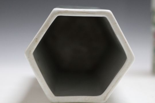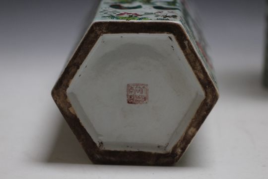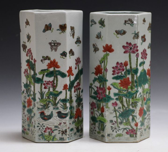 A PAIR OF CHINESE HEXAGONAL SLEEVE VASES, decorated with a pond scene with ducks and butterflies, six figure character mark to base, H 28 cm