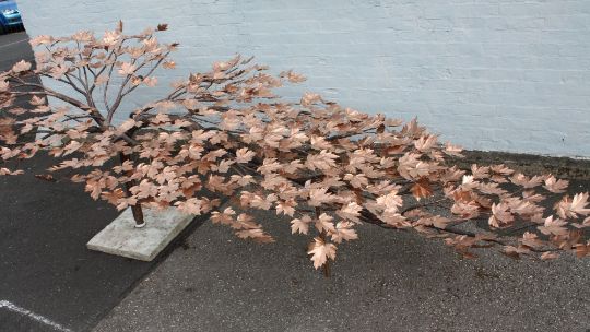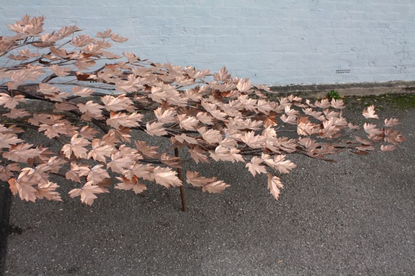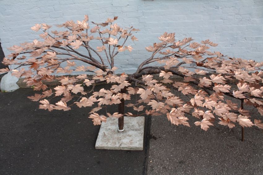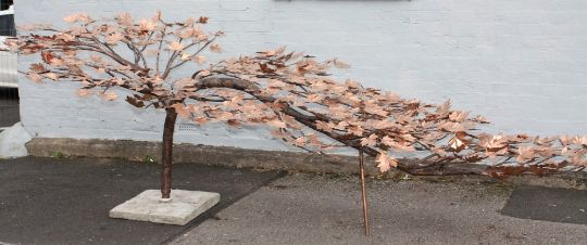 A STRIKING CONTEMPORARY LARGE COPPER 'TREE OF TRANQUILITY' SCULPTURE, handmade and designed by MEHRDAD TAFRESHI, designed with naturalistic trunk and a cascade of copper leaves, held with a support structure, approximate overall size: L 414 cm, H 125 cm, W 180 cm