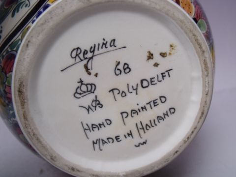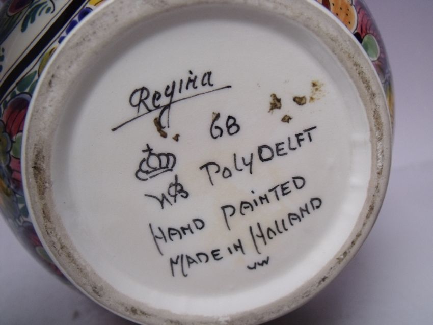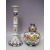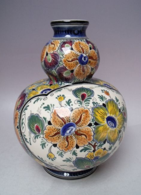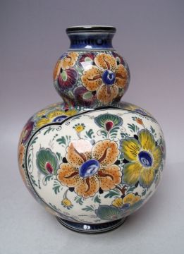 A 20TH CENTURY FRENCH FAIENCE POTTERY CANDLESTICK, H 37 cm, together with a Poly Delft double gourd vase (2)