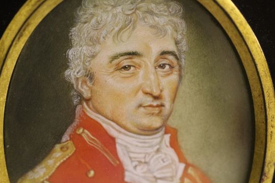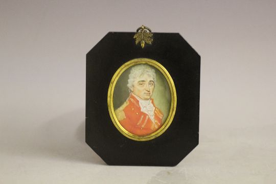 (XIX-XX). Oval portrait miniature of a gentleman in military dress and white stock, unsigned, framed and glazed, frame with acorn finial, 7 x 5.5 cm