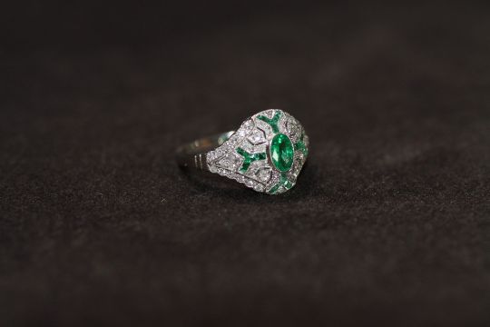 A PLATINUM VICTORIAN STYLE EMERALD AND DIAMOND DRESS RING, set with a central oval shaped emerald, Ring size M 1/2