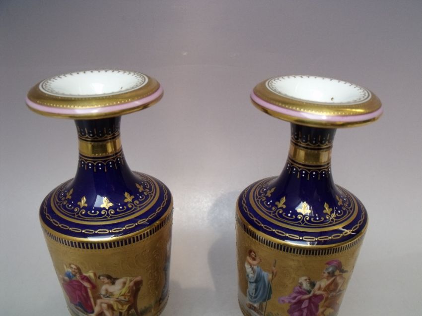 A PAIR OF ROYAL VIENNA GILDED PORCELAIN VASES, signature to bottom edge of figural central band, beehive marks to base, H 19 cm (2)