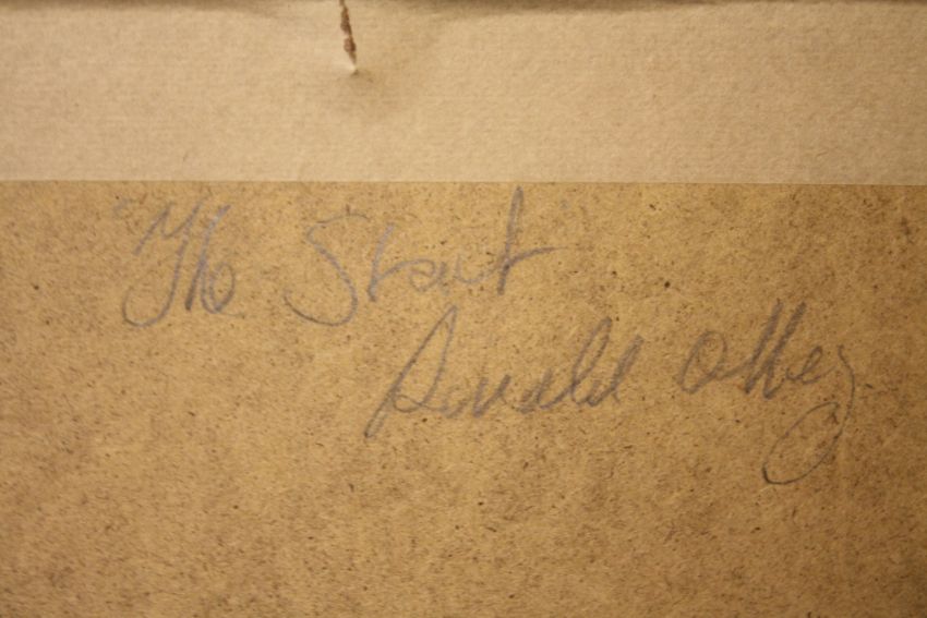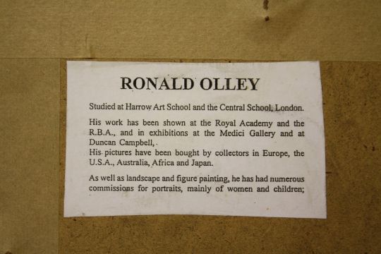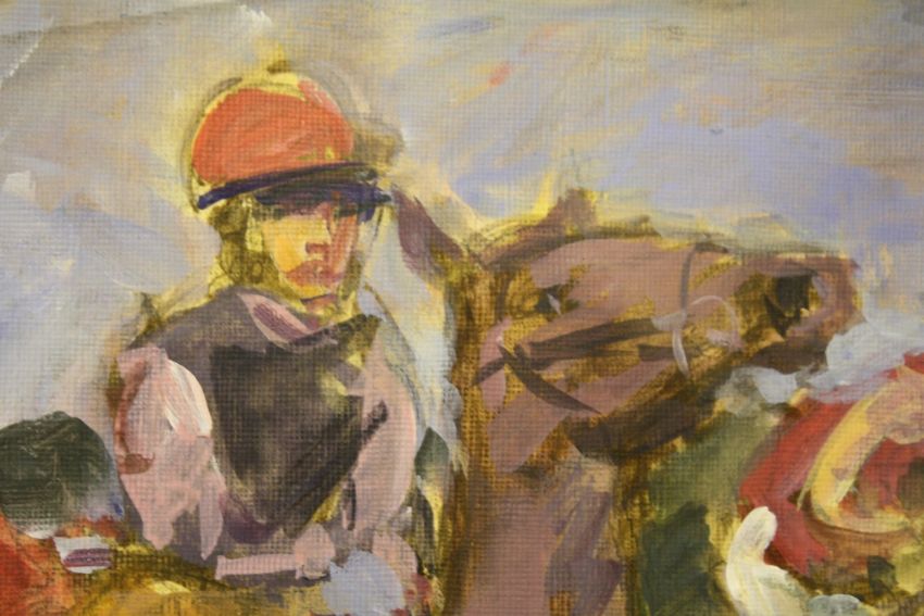 RONALD OLLEY. British school, impressionist horse racing scene 'The Start', see verso, signed and dated 2009 lower left, oil on canvas laid on board, framed and glazed, 25 x 26 cm