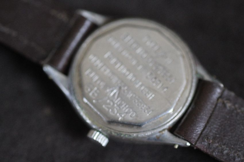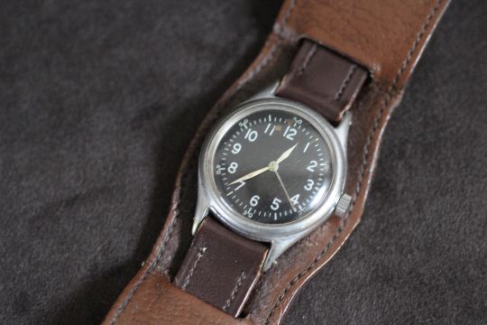 A BULOVA MILITARY A-11 TYPE WRIST WATCH, stamped spec no94-27834 serial NO AF 54714 PART NO 10 AKCSH ORDER NO W535AC 33934 BULOVA WATCH CO 6B/234, 3.5 cm