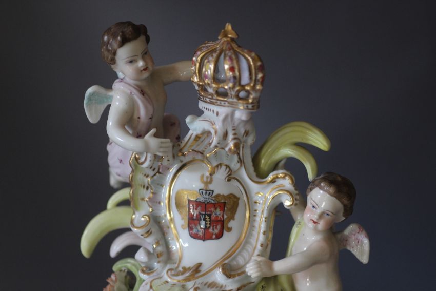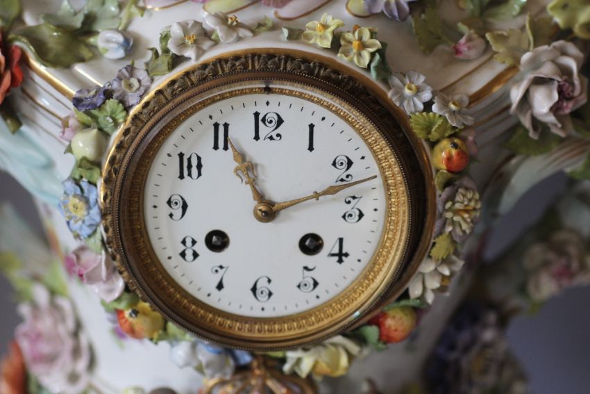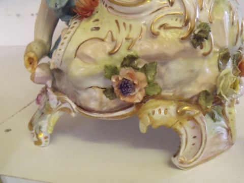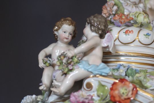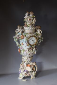 A LARGE AND IMPOSING CONTINENTAL CERAMIC TABLE CENTREPIECE LIDDED CLOCK URN, with typical figurative cherubic Putti embellishment, A/F, approx height 84.5 cm